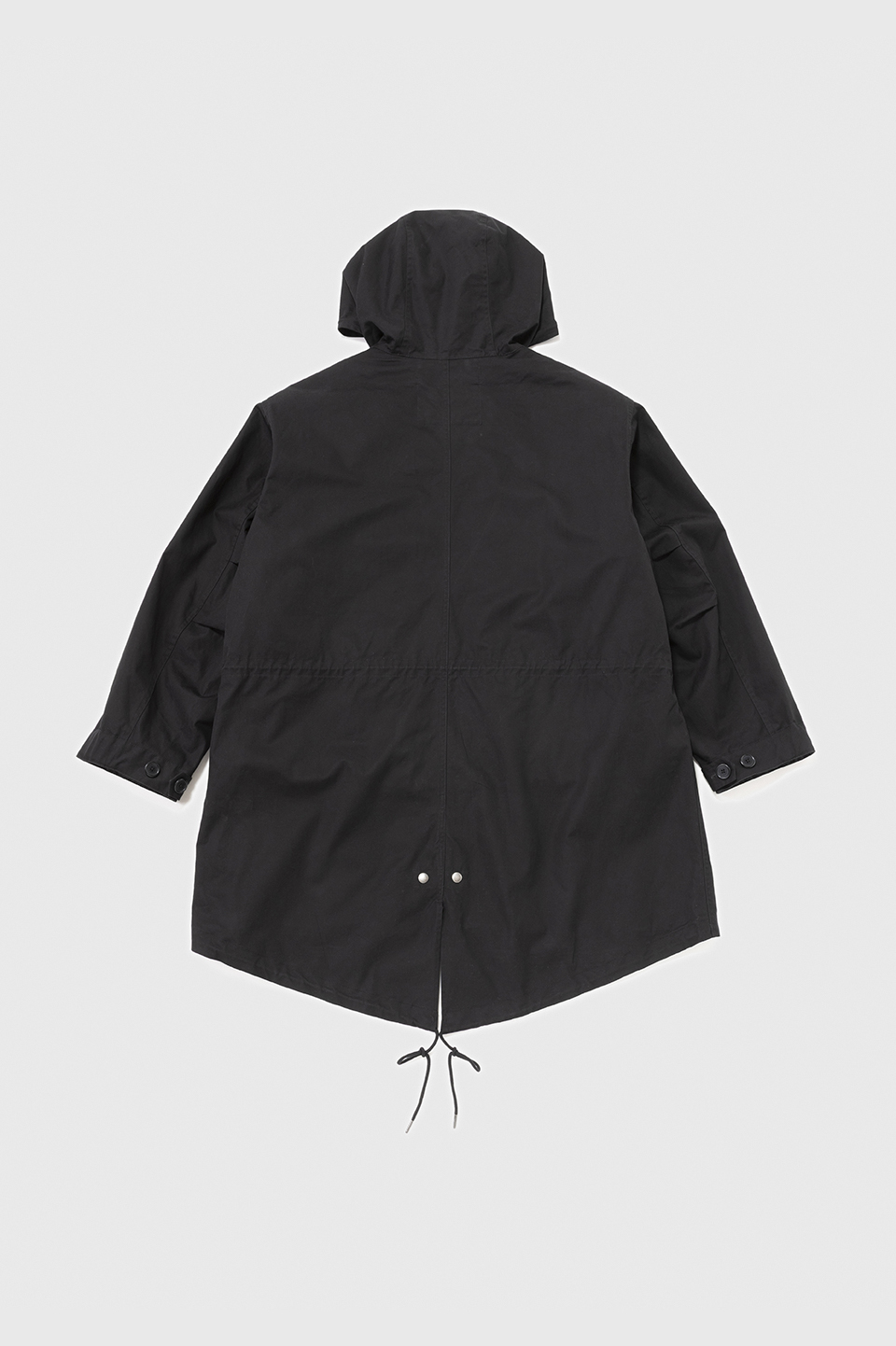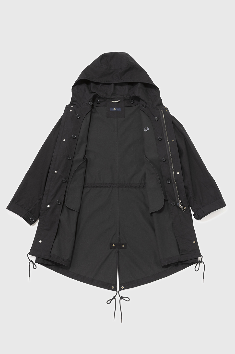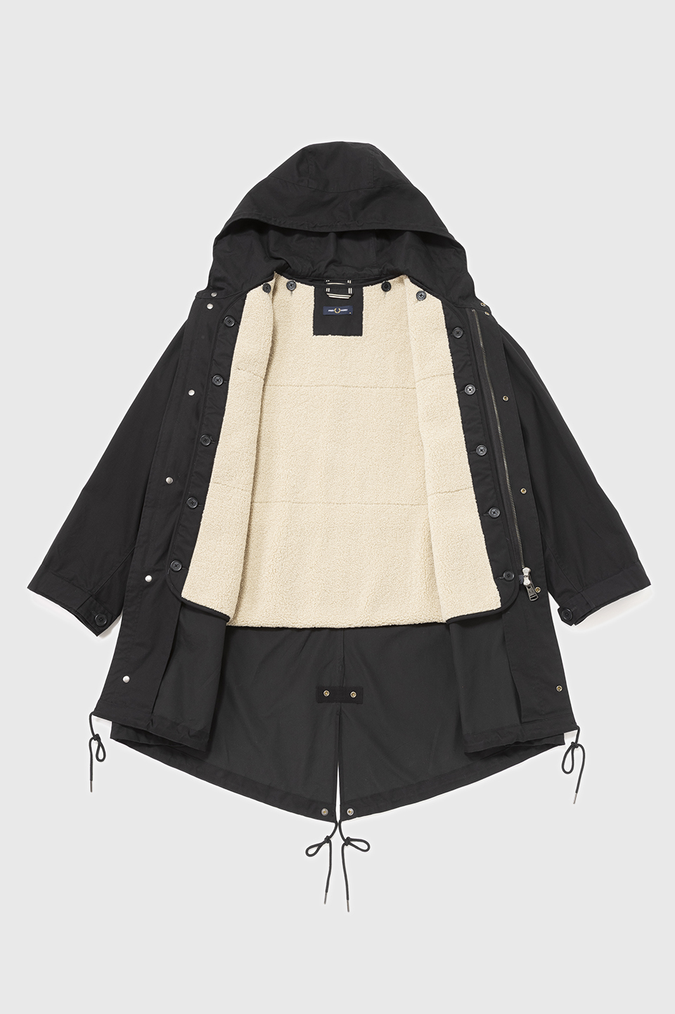 フード、着脱可能なライナー付き。フィッシュテールヘム。ウエスト内側と裾にドローコード。