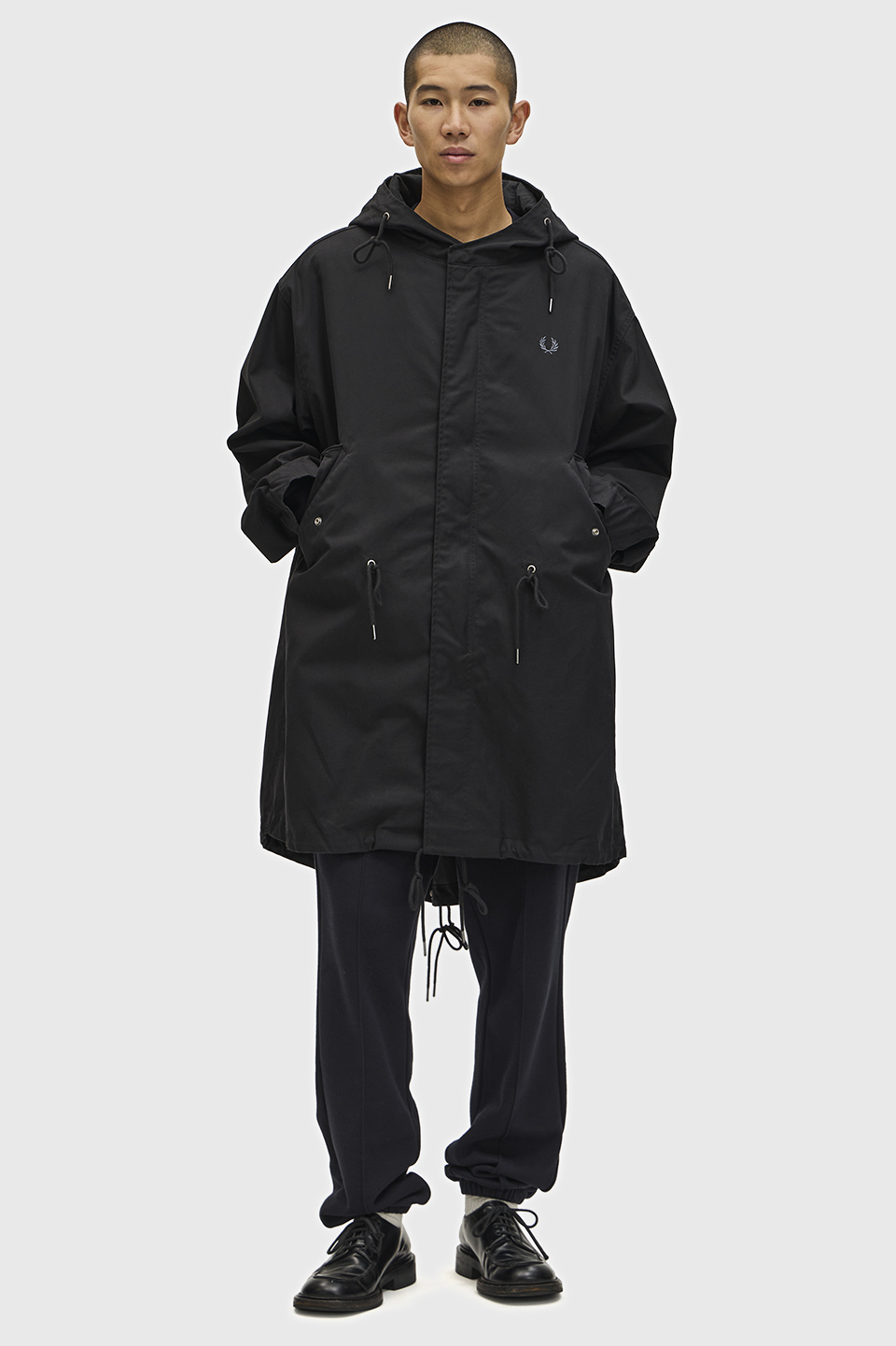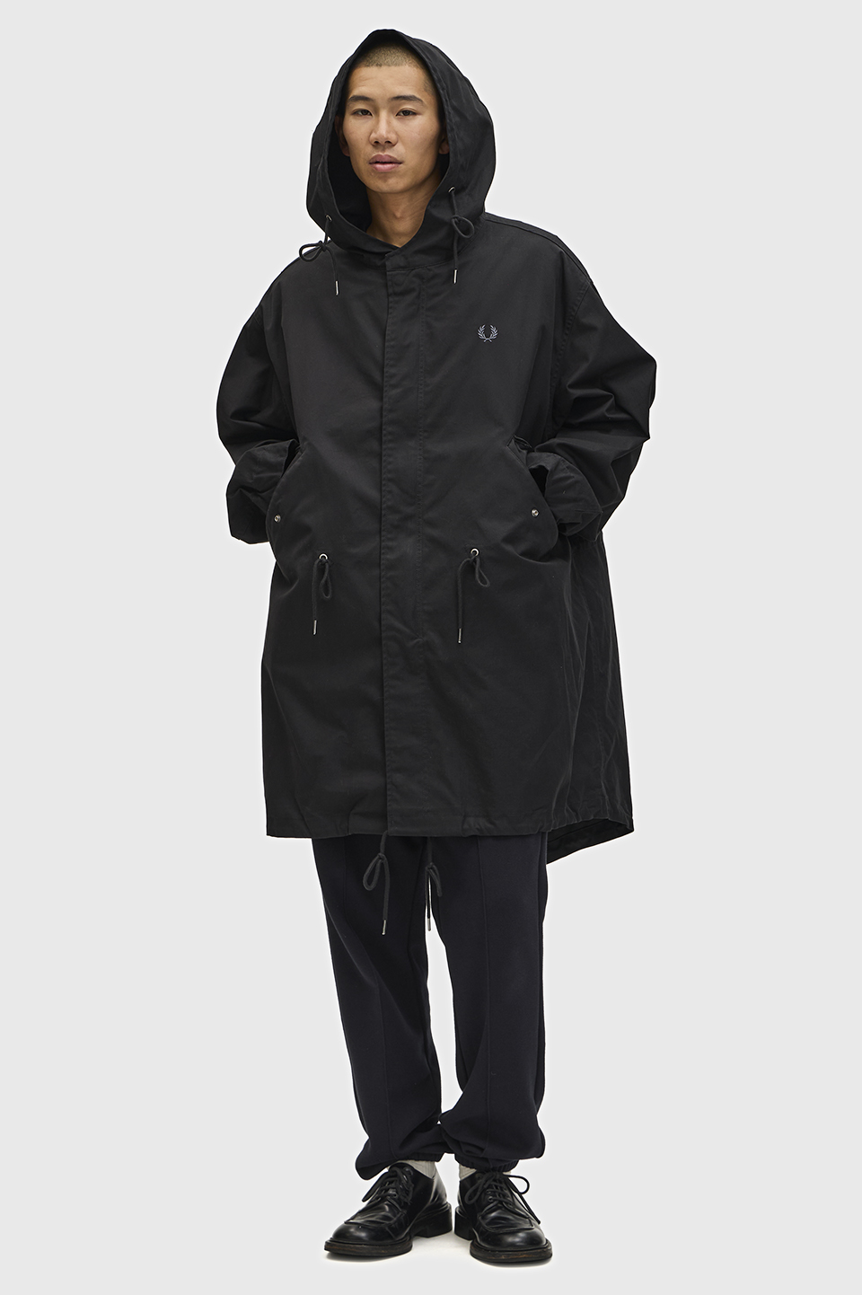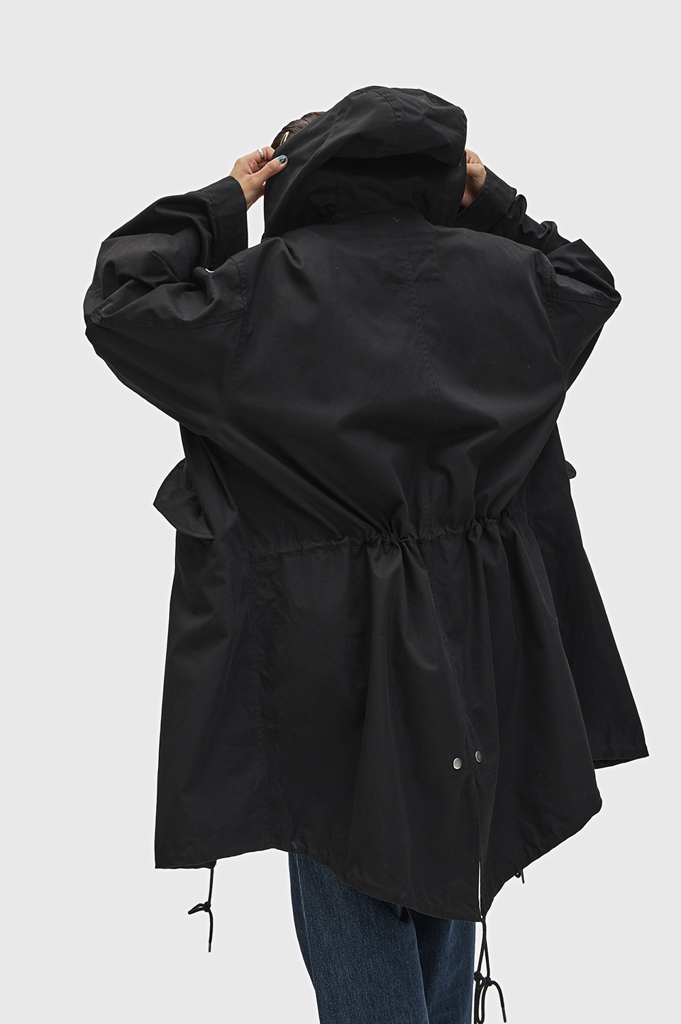 フード、着脱可能なライナー付き。フィッシュテールヘム。ウエスト内側と裾にドローコード。