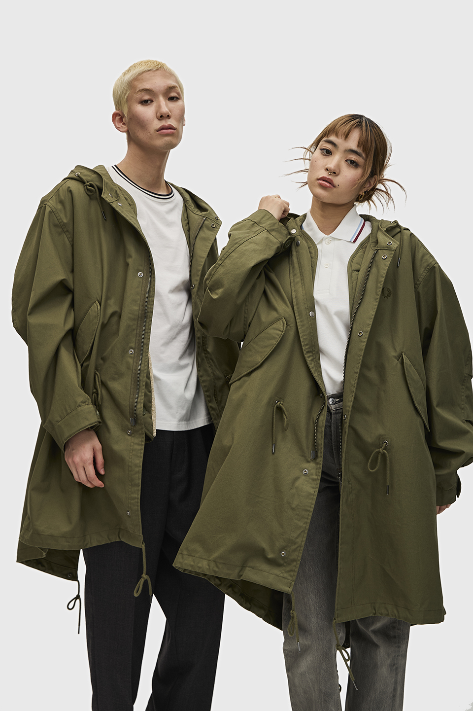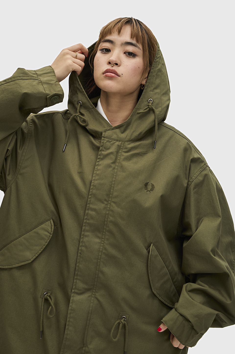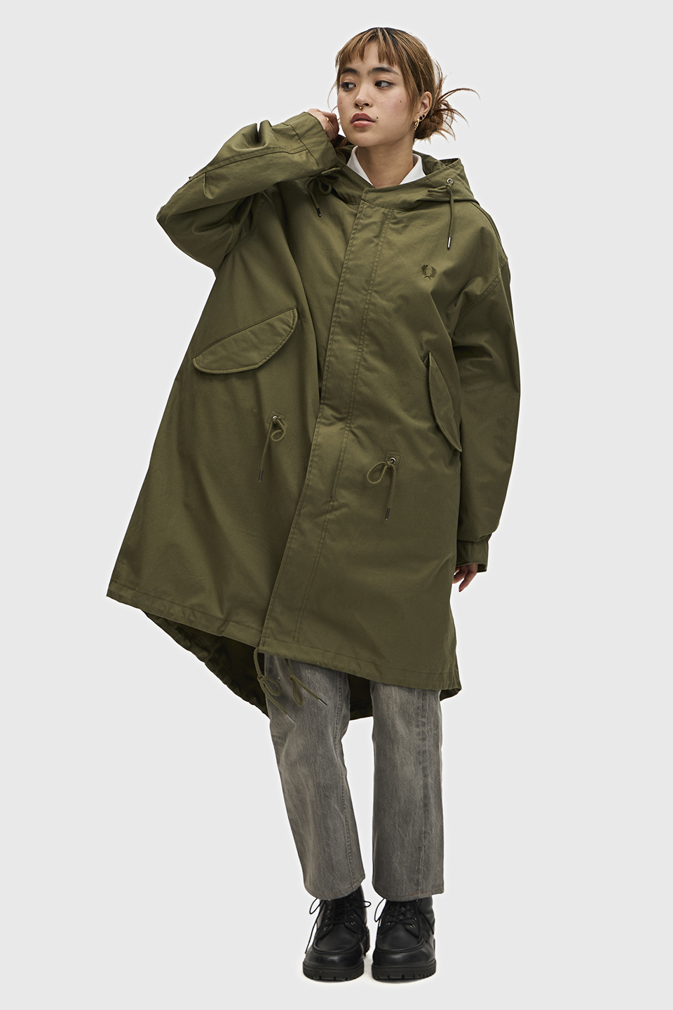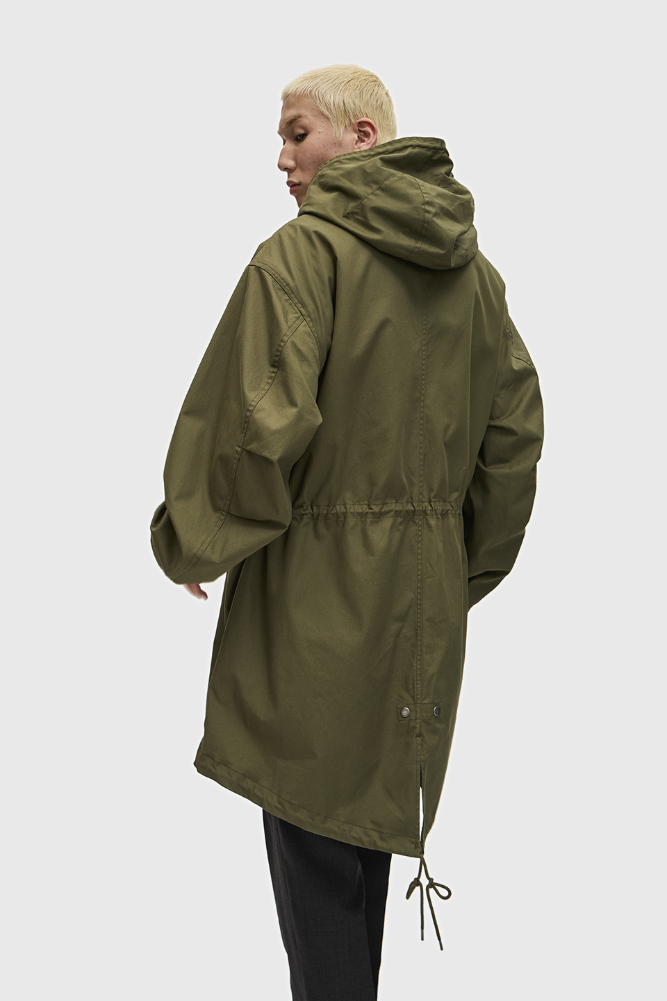 ビンテージのフィッシュテイルパーカを踏襲したオーバーサイズのジャケット。 90年代のサブカルチャーを反映させたデザインと、機能性を備えた本格的な全天候型アウター。 表地は起毛した高密度のコットンを使用、内側は着脱可能なジレスタイルのボアライナーを備えています。 ウエストと裾内側のドローコードでフィット感を調節できます。男女問わず着られるユニセックスデザインです。
