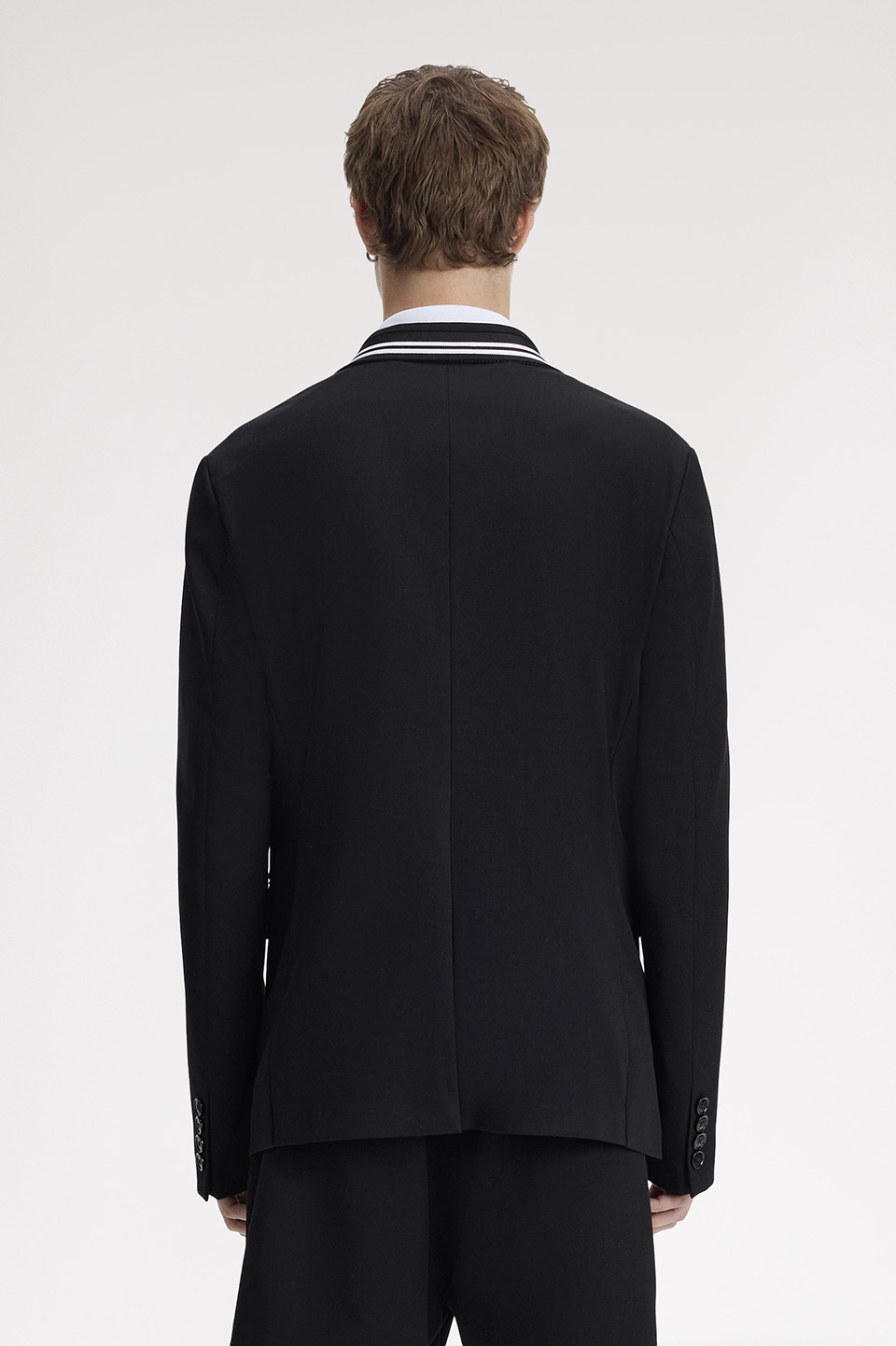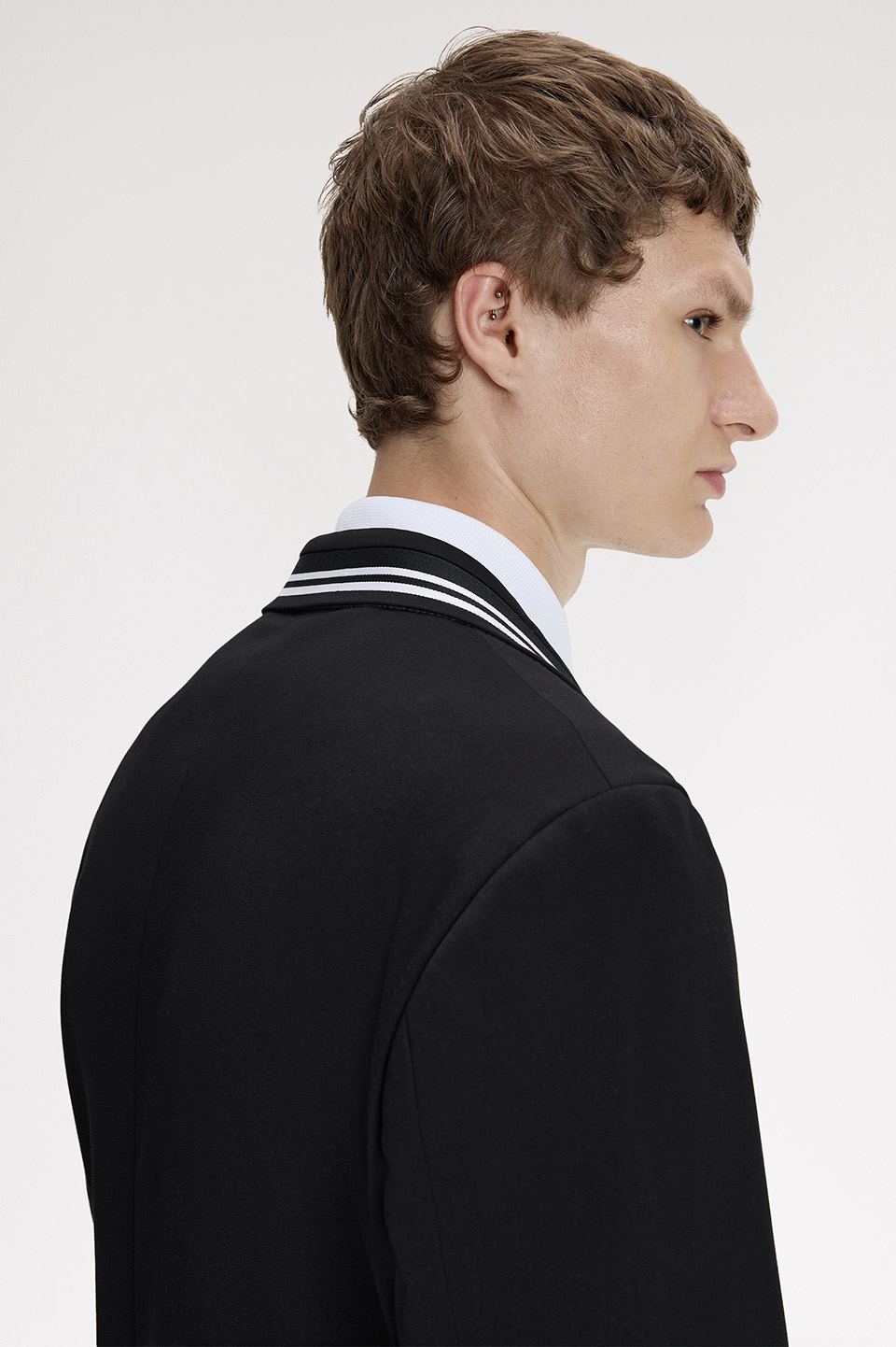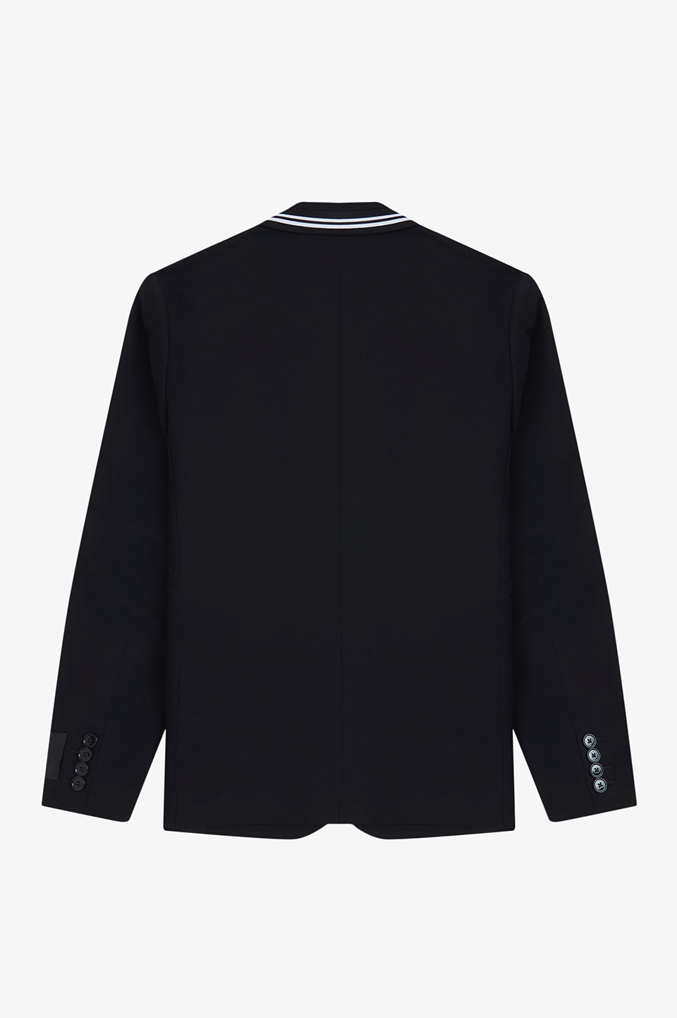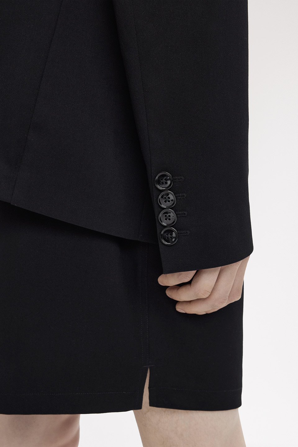 ポリエステルビスコース素材のブレザー。生地は涼しげで上品な光沢感があり、ソフトなラペルに施されたティップラインがアクセントになります。ポリッシュボタンとオリジナルロゴの入った裏地が細部までこだわりを感じさせます。セットアップ可能なショーツのご用意もございます。