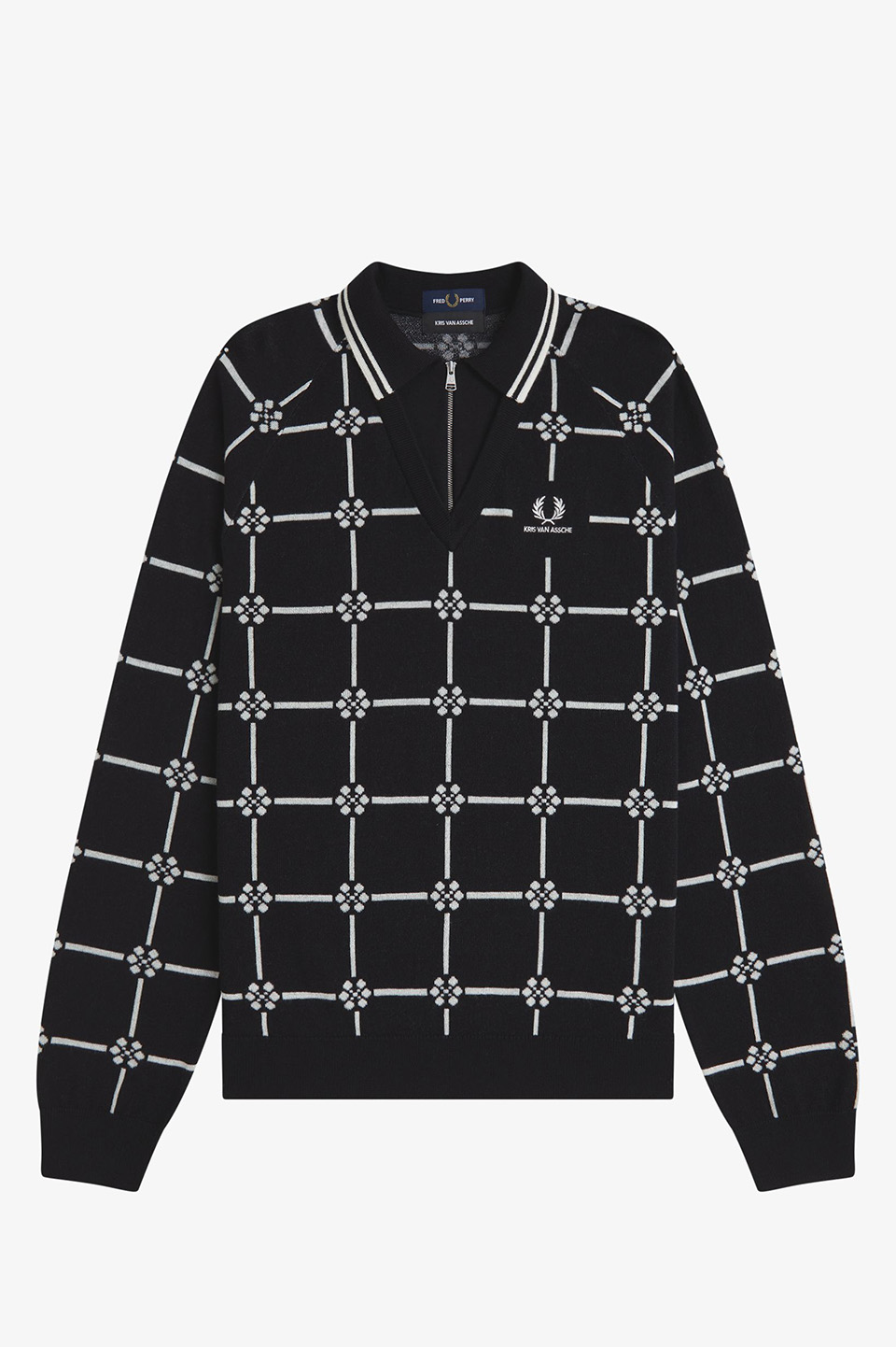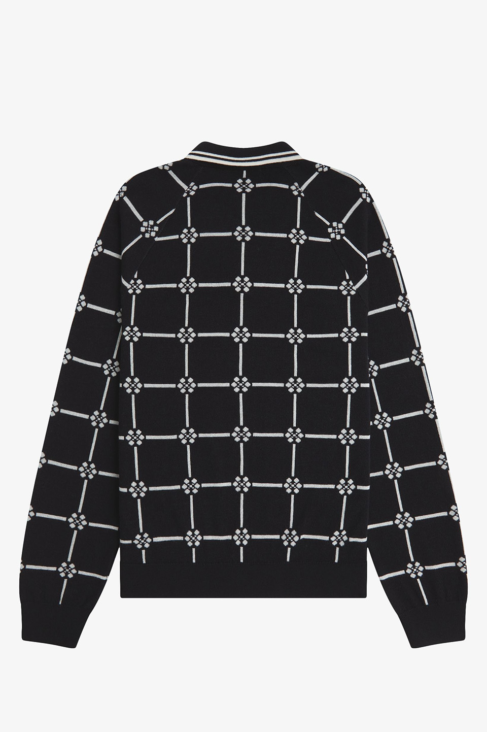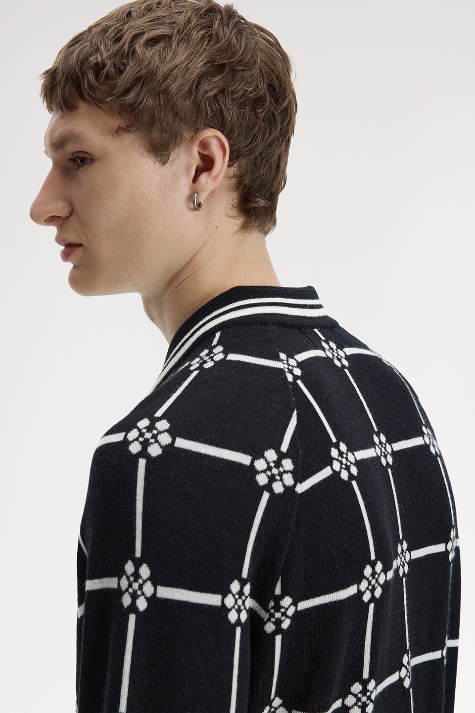 コットンウール素材のジップアップニットポロシャツ。シグニチャーである5:4:4比率のティッピングと繊細なフローラルパターンが上品なアクセントとなり、ポロインサートがクラシックなレイヤードスタイルを演出します。リッチなジャガードで柔らかさと適度な厚みを両立。ジップ仕様により着脱もスムーズです。