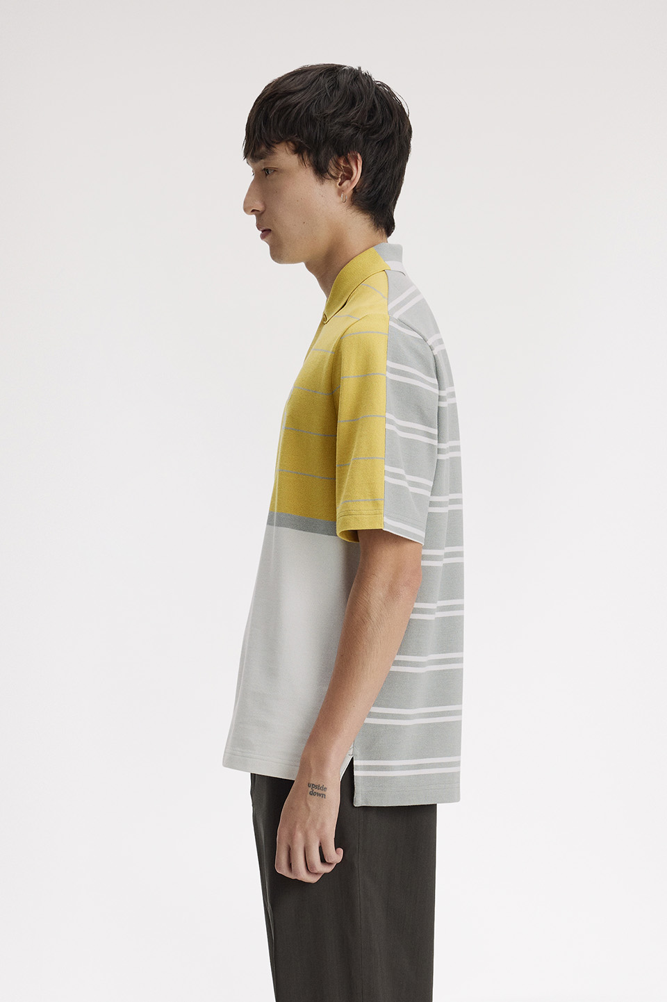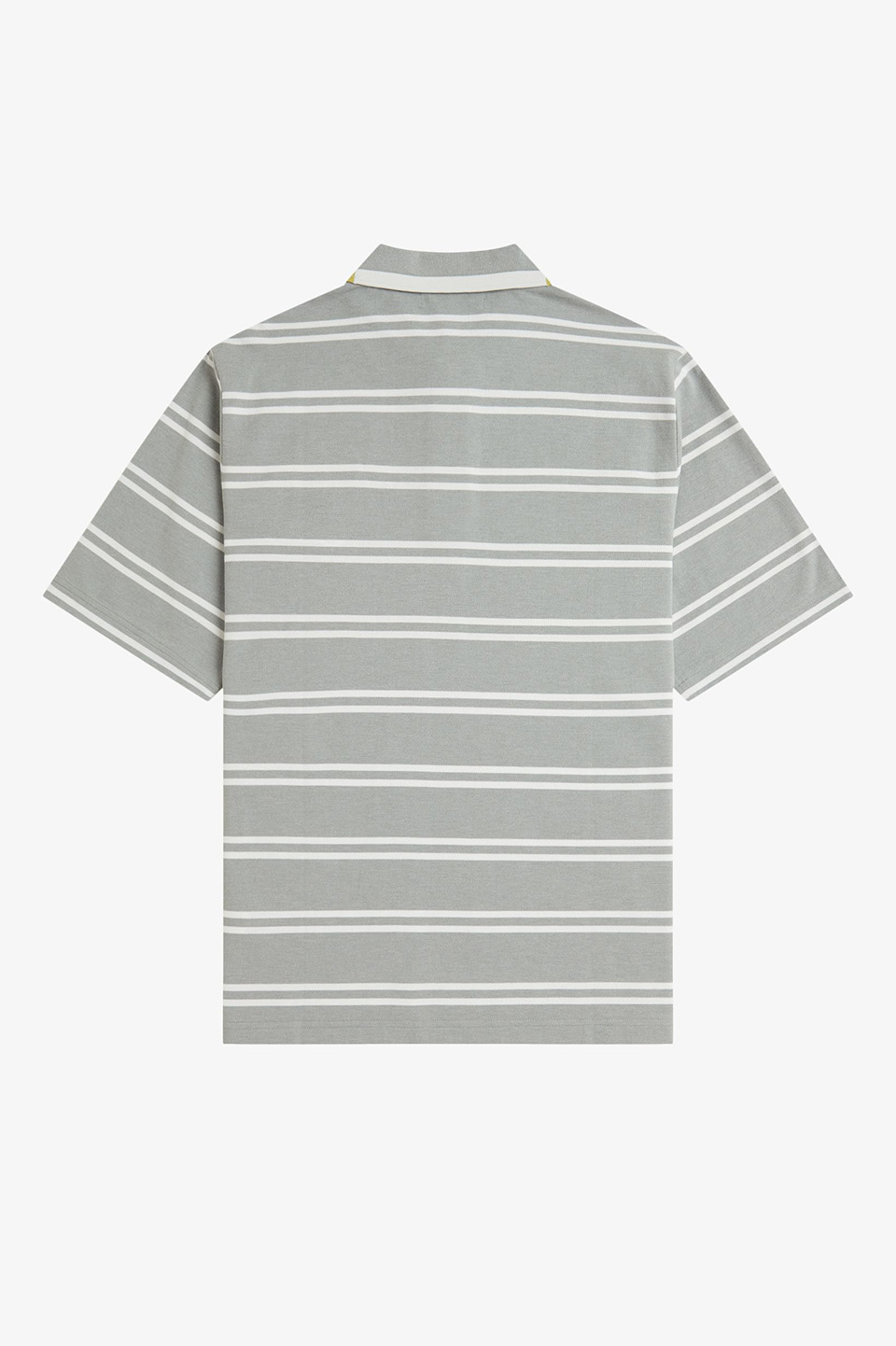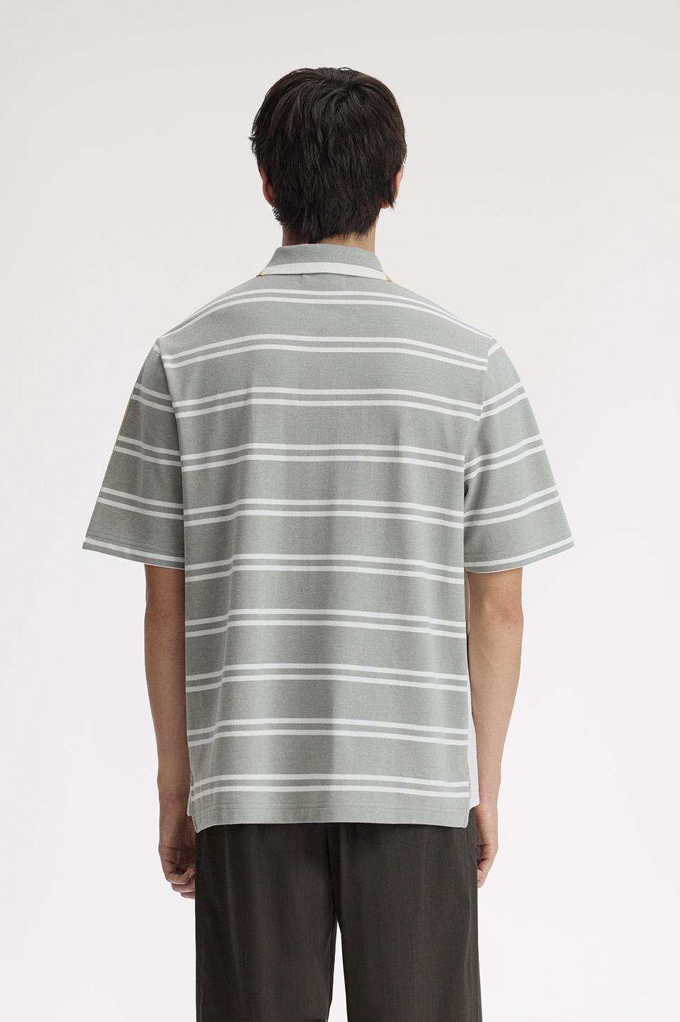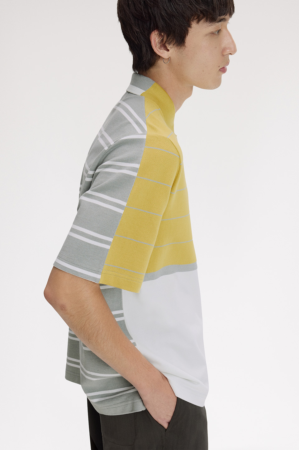コットンピケ素材のハーフ&ハーフポロシャツ。前身頃と後身頃に異なった先染めストライプを組み合わせたデザインや、スリットと前後差のある裾が特徴です。リブのない袖口やゆとりのあるシルエットが快適な着心地を実現。こだわりのディテールが随所に施されています。