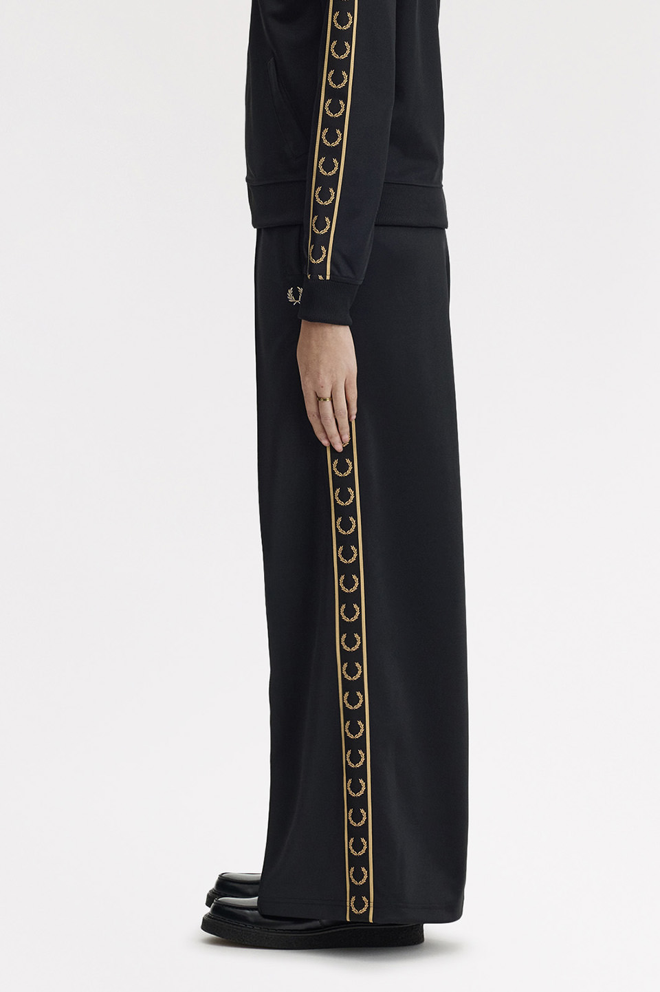 。シグニチャーのテープはブラック×シャンパンのカラーリングで、軽量でストレッチ性のあるボトムスです。セットアップ可能な