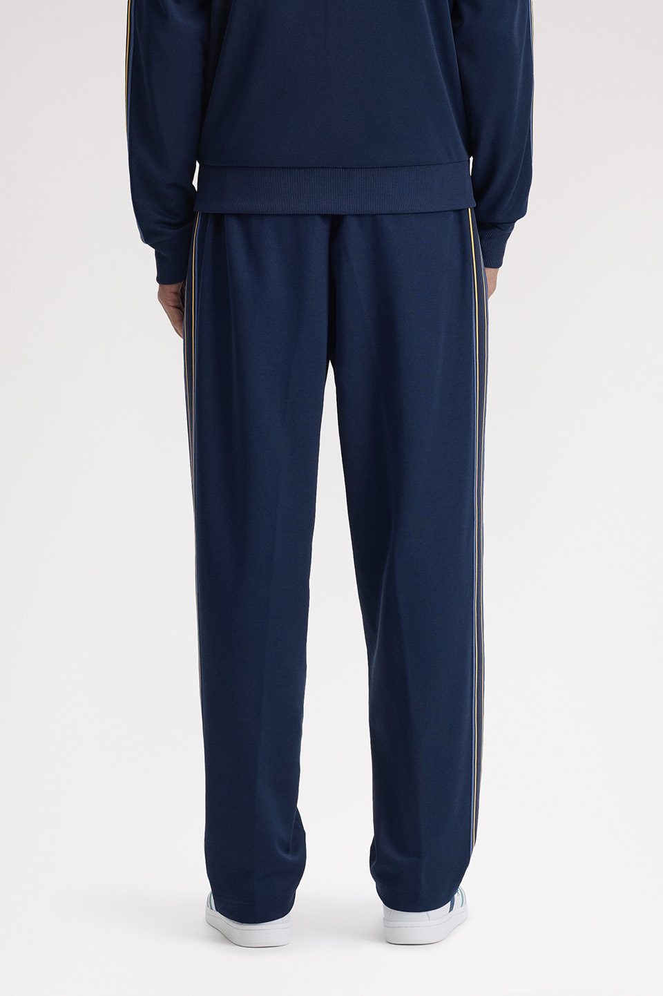 フレッドペリーの代表的なアイテムのひとつでもあるトラックジャケットとセットアップにできるトラックパンツ。光沢感のあるトリコット素材を使用しています。側章にあしらったトラムラインテープがデザインポイントです。